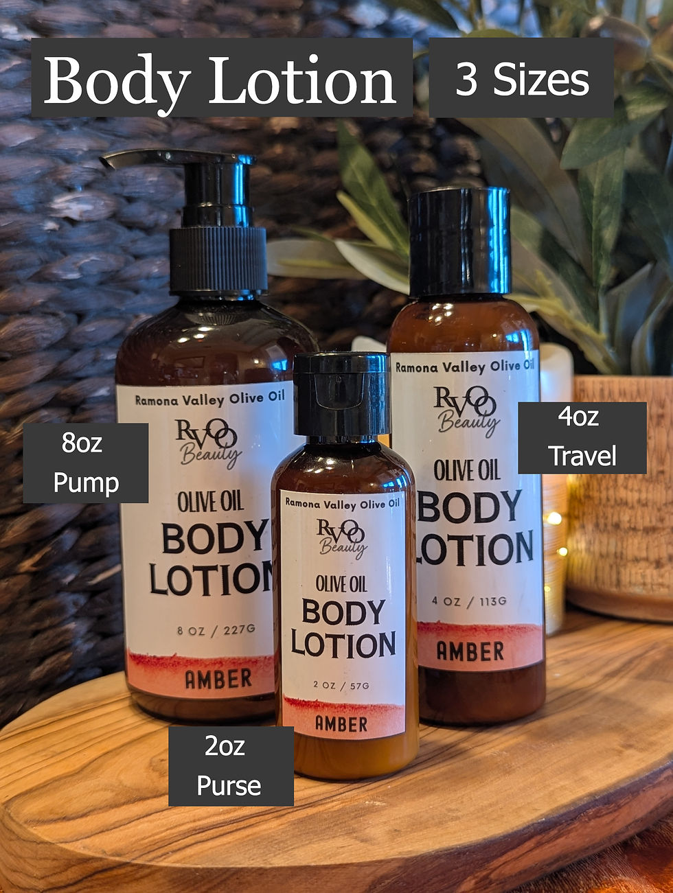 Made with Shea Butter, Mango Butter, and Ramona Valley Organic Extra Virgin Olive Olive Oil. With Vitamin E for extra care. Our lotion is light and absorbs quickly with no greasy or shines. It's perfect for every day hydration to keep your skin soft and supple all year long. Available in 3 sizes - 8oz pump, 4oz travel, and 2oz purse, you will find the perfect size for you. Available in 3 or our signature scents, Cranberry, Amber, and Relax. For the Holidays we have a special additional scent - Candy Cane! Get it while you can! Perfect for birthdays, teachers gifts, or hostess gifts. You won't find the luxury of Olive Oil Body Lotion and skincare anywhere else! Especially made with organic and award winning Olive Oil. These make great stocking stuffers or just perfect for treating yourself to a little luxury.